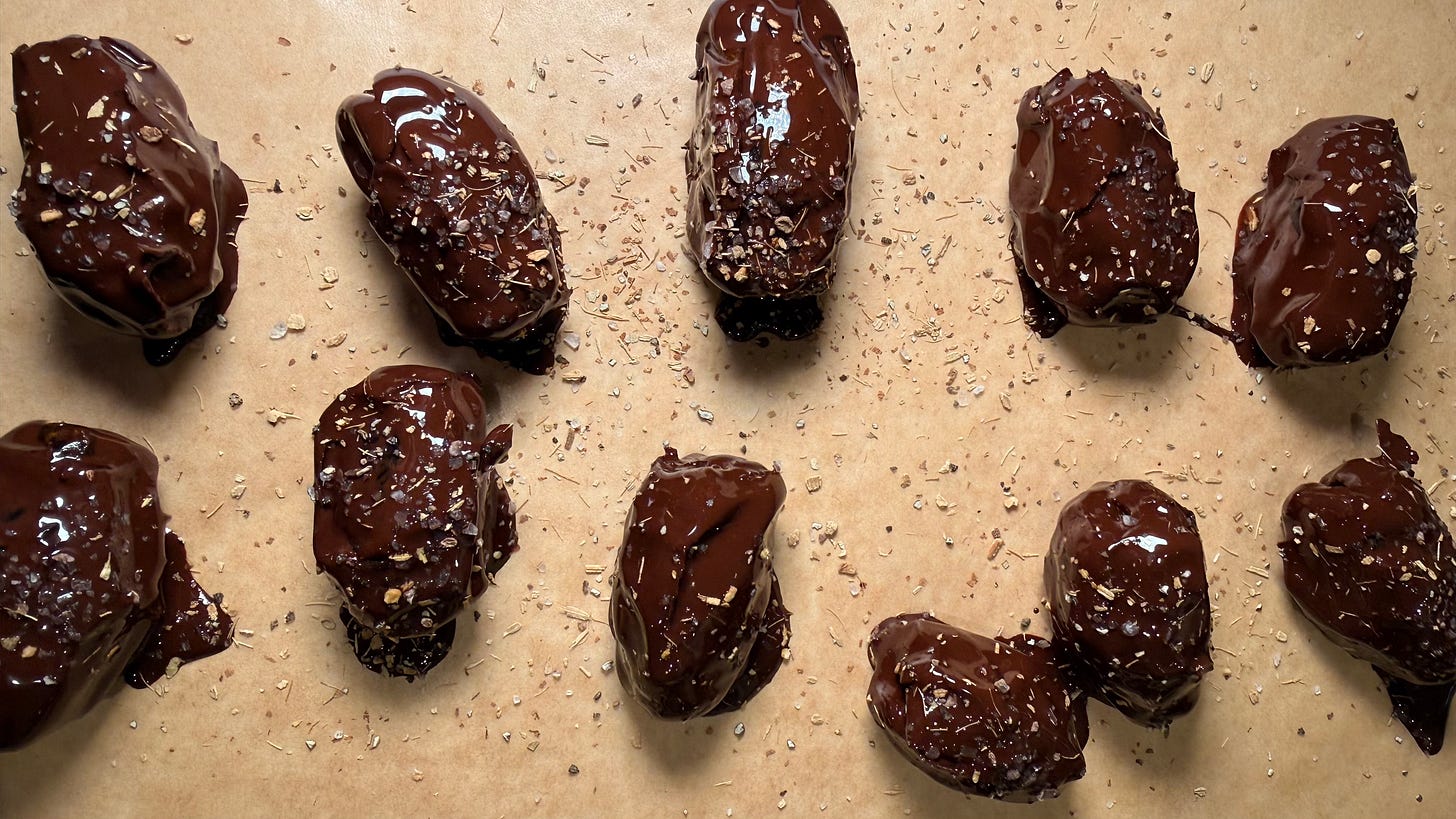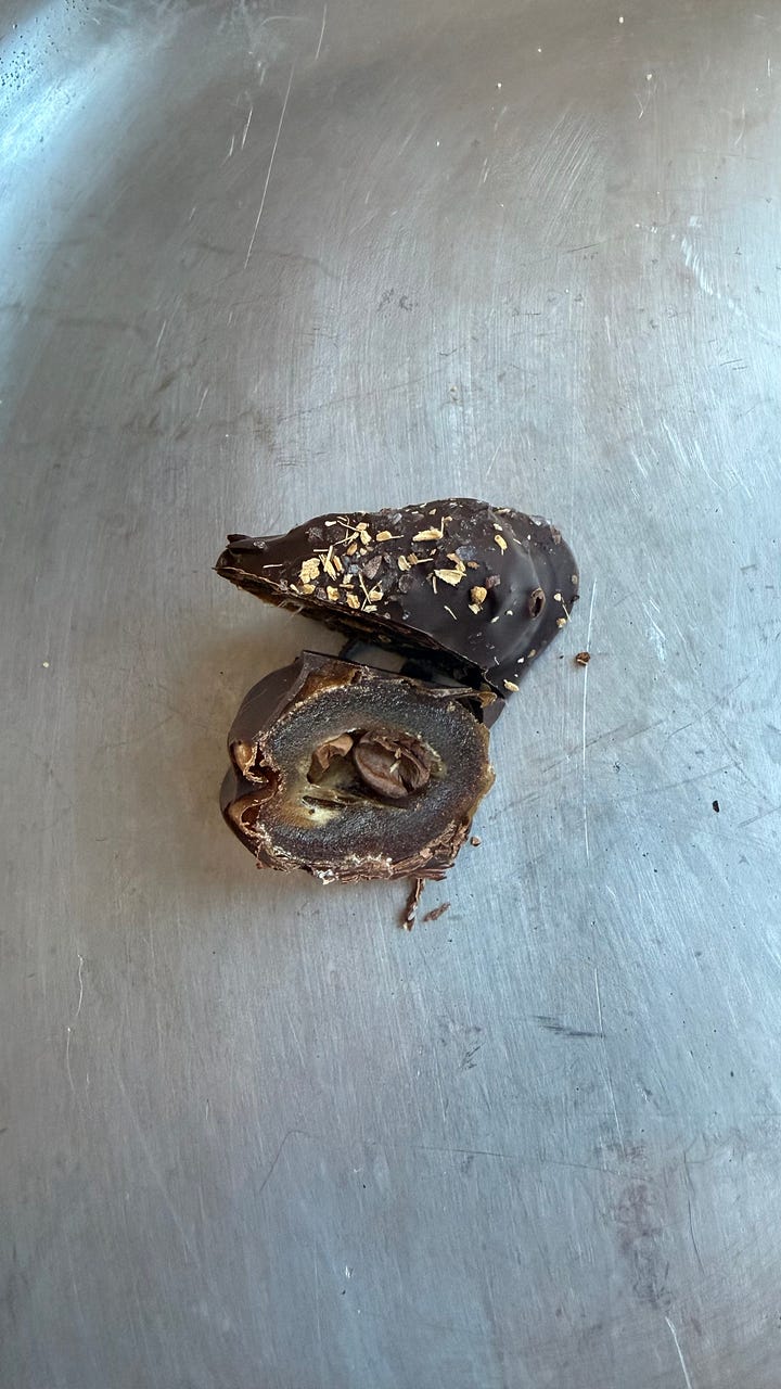 To make, gather your ingredients: dates with their pits in, chocolate, coffee or nut butter. It’s important to use dates with their pits still in because it makes for a softer treat that is easier to stuff. Remove the pits and calyx (remainder of the stem) of the date. Fill with 4 coffee beans or a spoonful of nut butter. Squeeze together and then dip in melted chocolate! Sprinkle with salt and cardamom while still warm.